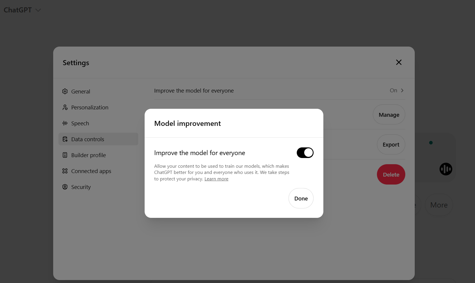 This gives you more control over your data while still enjoying ChatGPT’s capabilities. Head to Settings > Data Controls and toggle off “Improve the Model for Everyone” if you don’t want your conversations used to train future models.