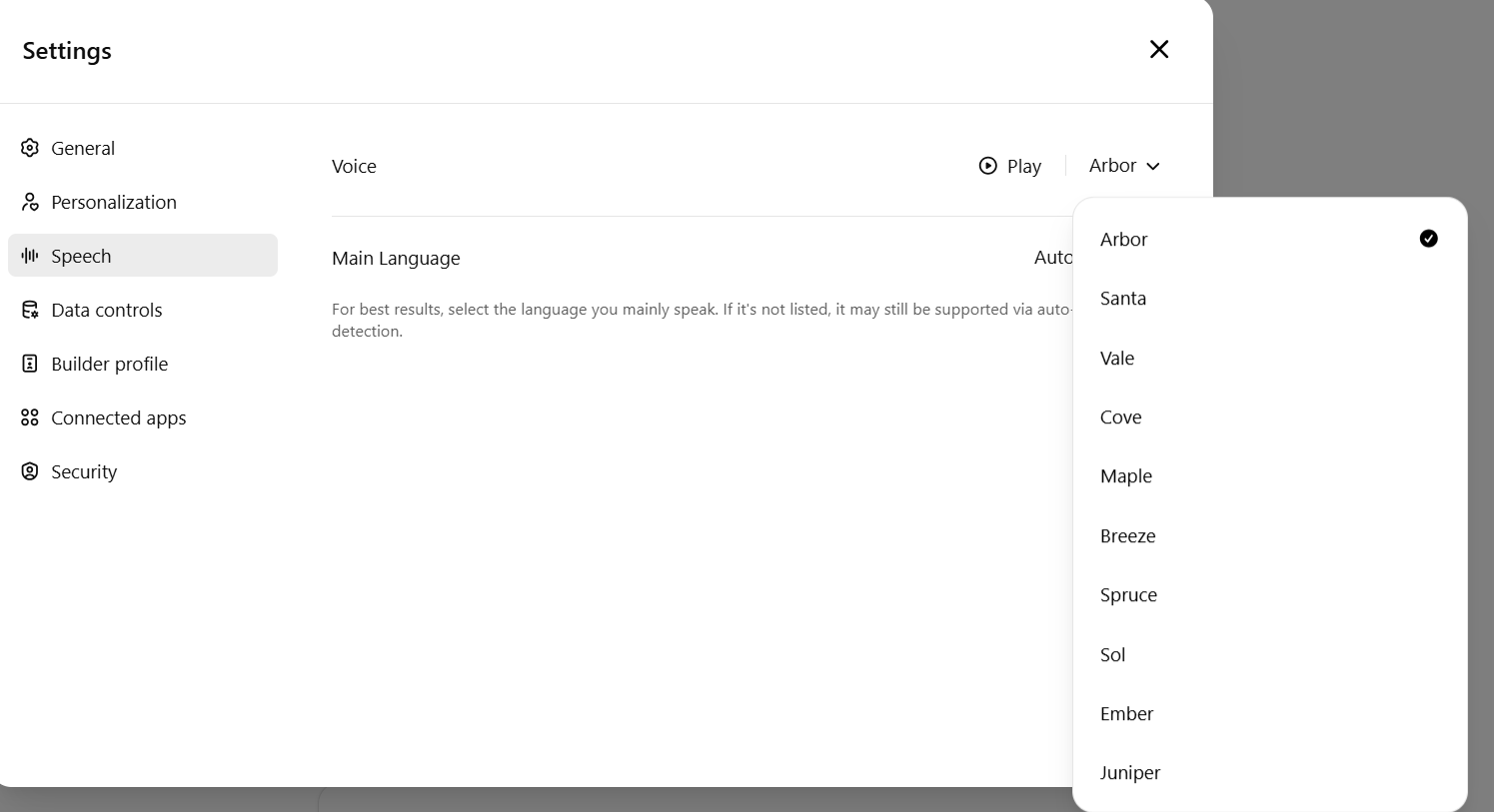 ChatGPT offers free monthly previews of advanced voice mode so you can test natural conversations. When using this feature for the first time, you’ll need to choose a voice personality – like Santa, Vale, or Cove. You can also always change your voice personality by clicking Settings>Speech>Voice.