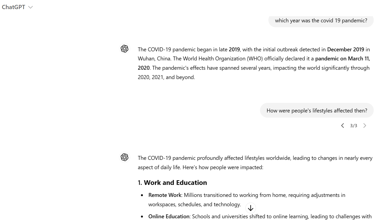 When I asked about the COVID-19 pandemic’s start date, then followed up with “How were people’s lifestyles affected then?” ChatGPT understood exactly what timeframe and topic I was referring to.