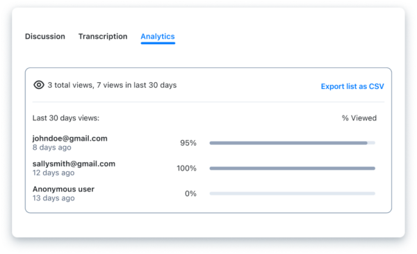 | Analytics | ✅ Viewer insights (emails, % watched)