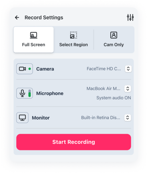 Record full screen, tabs, apps, or a custom area. Here are the options: