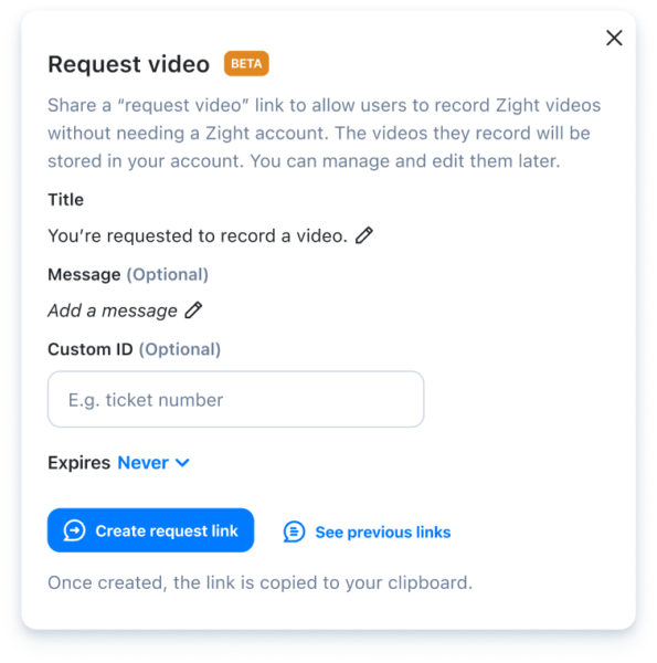 Zight makes it simple with the easy-access ‘Request Video‘ feature. Just create and send a link, and anyone can record a video response straight from their browser, even if they don’t use Zight.