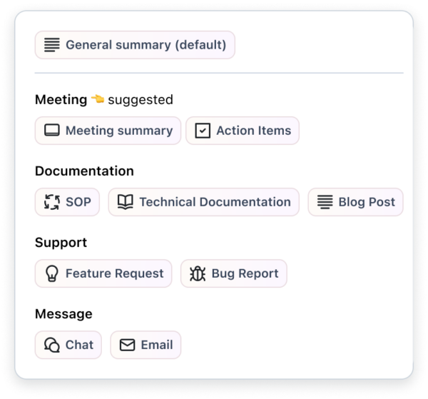 - Smart Actions that generate SOPs, meeting notes, FAQs, bug reports, and more in seconds