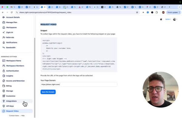 Enabling the Request Video feature is simple. Once activated in your Zight settings, you can install a small snippet on your website and begin creating customized request links. These links can include your own domain, ensuring a branded and trustworthy experience for customers.