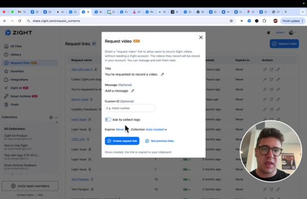 - When creating a new request video link, you will see a section called “Ask to Collect Logs.” Click on that button to proceed.