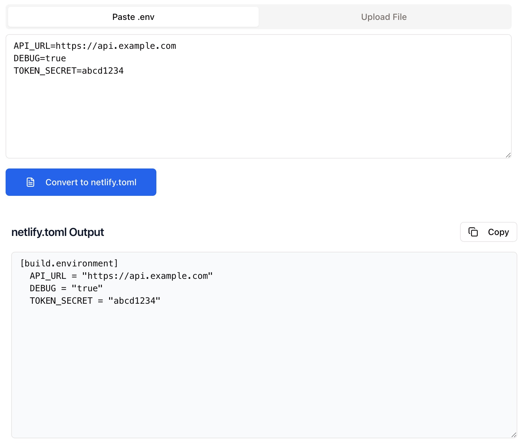 Use the Copy button to copy the converted code, then paste it directly into your netlify.toml file at the root of your project. You can commit and deploy immediately — no additional formatting required.