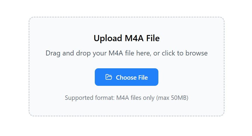 Drag and drop your M4A to this page into the upload area, or click the Choose File button to select an M4A file manually from your device. The max file size is 50 MB. Zight will handle detecting the file type.