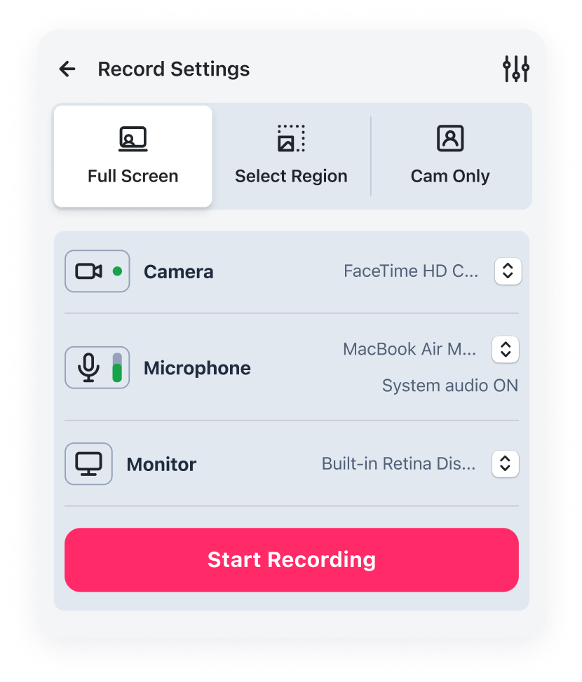 - When you do so, you will see your screen recording preferences, including Full Screen Select Region, Screen Only, and Screen & Cam.